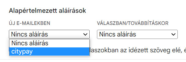 Az alapértelmezett aláírások résznél állítsuk be a most létrehozottat az 'Új e-mailekben' és a 'Válaszban/továbbításkor' opciókhoz is.